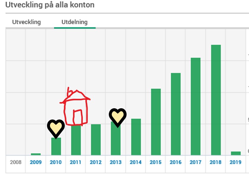 Nedan kan ni se aktieutvecklingen under denna perioden på innehav hos Avanza. Förklaring till mina fina bilder talar för sig själva. Hjärtan är när mina barn föds och huset när hus köps. Jag hade också en stjärna inlagt men jag tog bort den men den skulle stå för framtiden. Sikta mot stjärnorna tyckte jag var passande för oss som håller på med det till synes orimliga målet att själva bestämma om vi vill jobba eller inte. Men det blev för töntigt så jag fick ta bort den.