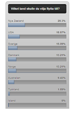 Resulatet i denna statistiskt säkerstälda undersökning (OBS ironi) går till Nya Zeeland. Kanske inte så oväntat då Nya Zeeland har en fantastisk natur, låg kriminalitet och är lite likt Sverige på många sätt. Det är lite som en fusion mellan Sverige på 80-talet/Norge och Storbritannien. Lite oväntat är att Australien är mindre populärt.
