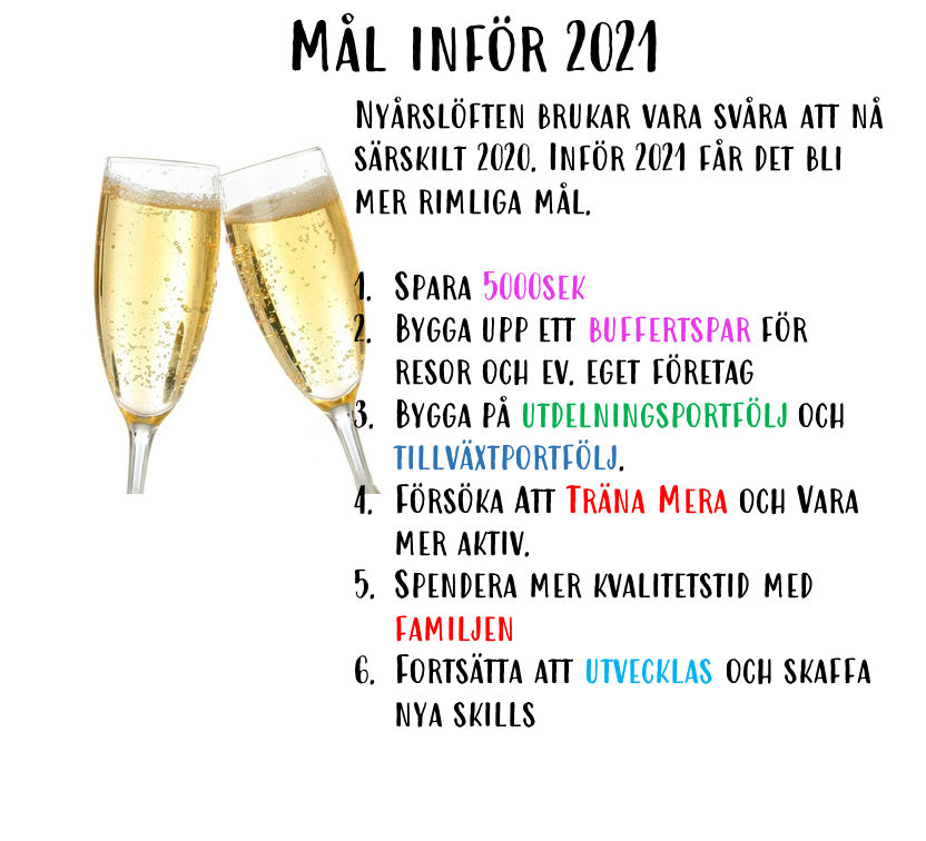 Jag tror egentligen inte på nyårslöften. De flesta brukar vara brutna innan de ens påbörjats. Hur många gymkort köps inte för att sen aldrig användas. Men jag sätter upp lite mål inför året och i år har jag satt rimliga tycker jag. Om man ska nå sina mål så ska de vara SMART (Specifikt, Mätbart, Accepterat, Realistiskt, Tidsbundet). Nedan är mina mål inför 2021!
